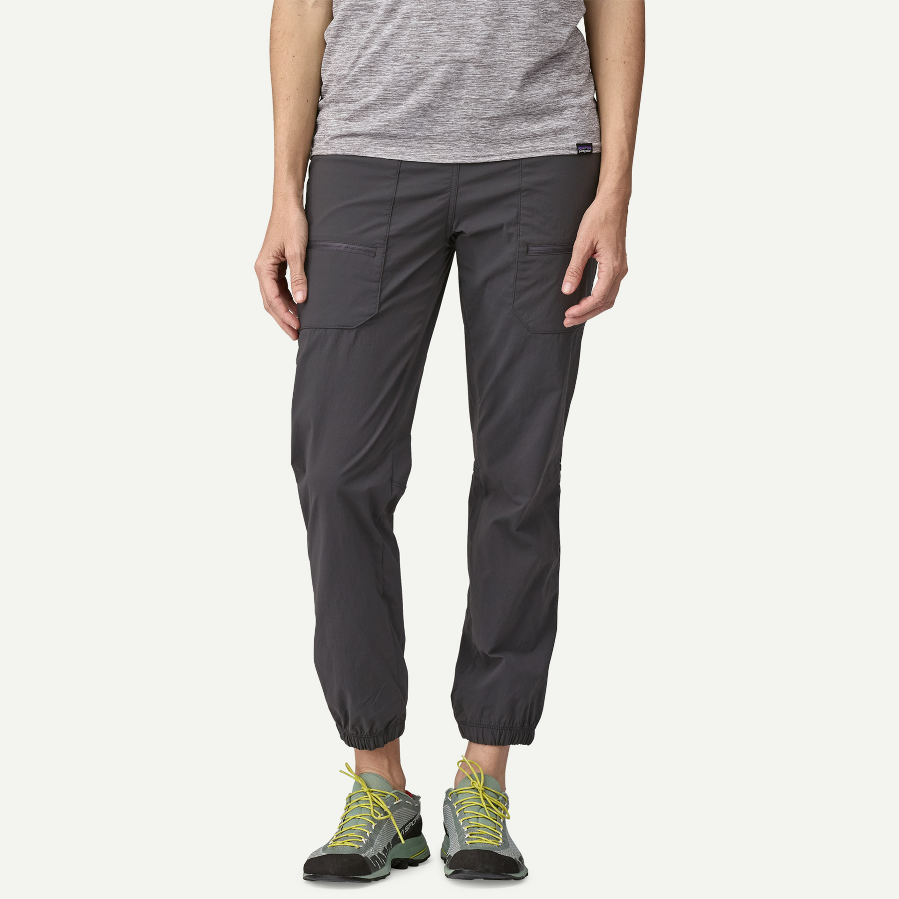 The classic Quandary Pants, now in a jogger silhouette. These multifunctional hiking pants are built of 96% NetPlus postconsumer recycled nylon made from recycled fishing nets to help reduce ocean plastic pollution/4% spandex plain weave; with a durable water repellent (DWR) finish made without intentionally added PFAS to resist light moisture, and 40+ UPF sun protection. Inseam (size S) is 28″.